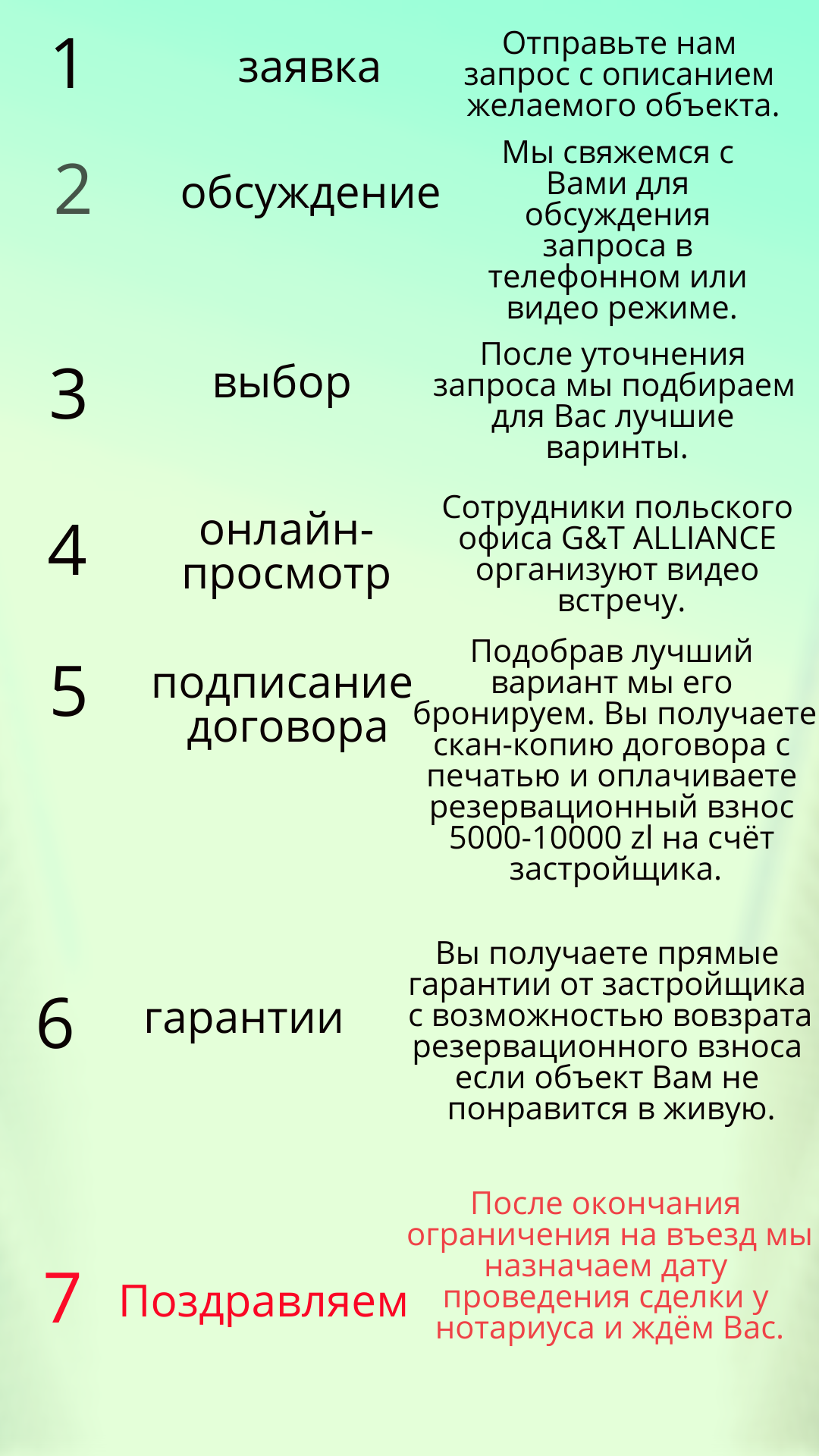 В режиме эпидемии и ограничения на въезд в Польшу все компании переходят в онлайн и мы не исключение. Сейчас у всех освободилось масса времени для изучения лучших вариантов инвестирования в недвижимость Варшавы, поэтому мы предлагаем нашим клиентам вариант удалённого бронирования и приобретения лучших вариантов. Все государственные структуры Польши работают в обычном режиме, застройщики строят объекты, проводят онлайн-показы, заключают сделки удалённо и к тому же предлагают прекрасные скидки и индивидуальные предложения для каждого клиента. Компания G&T ALLIANCE также предлагает своим клиентам удалённый режим взаимодействия, выбора, бронирования и покупки объектов. Детальный алгоритм на фото.